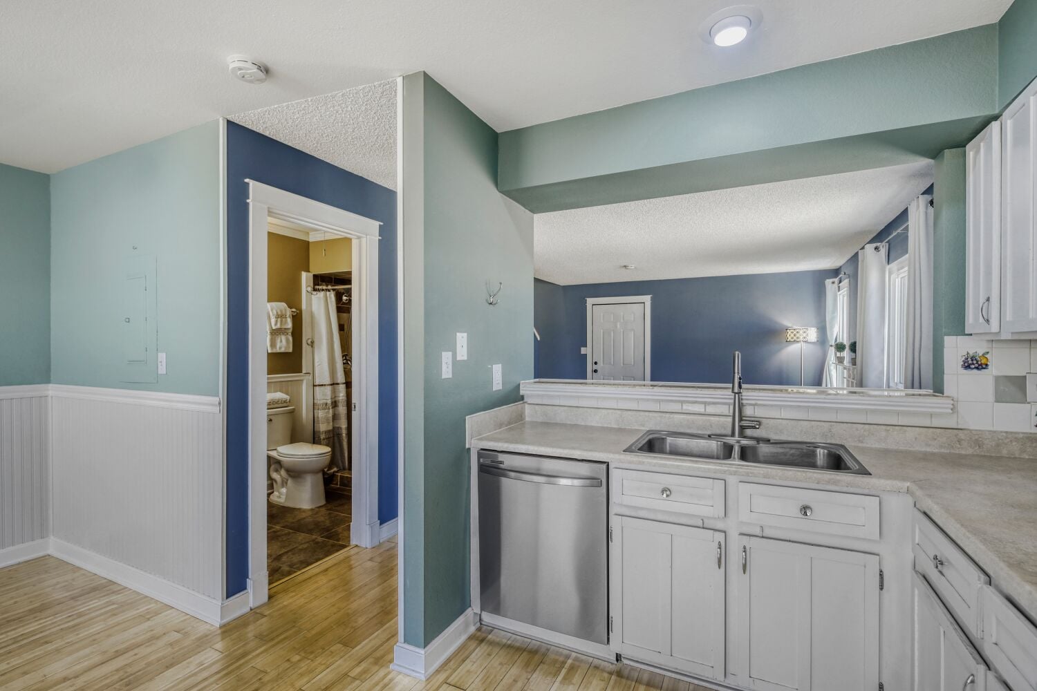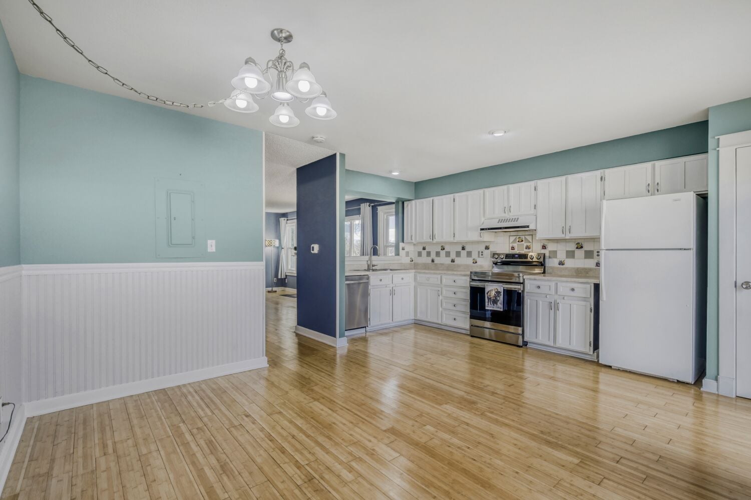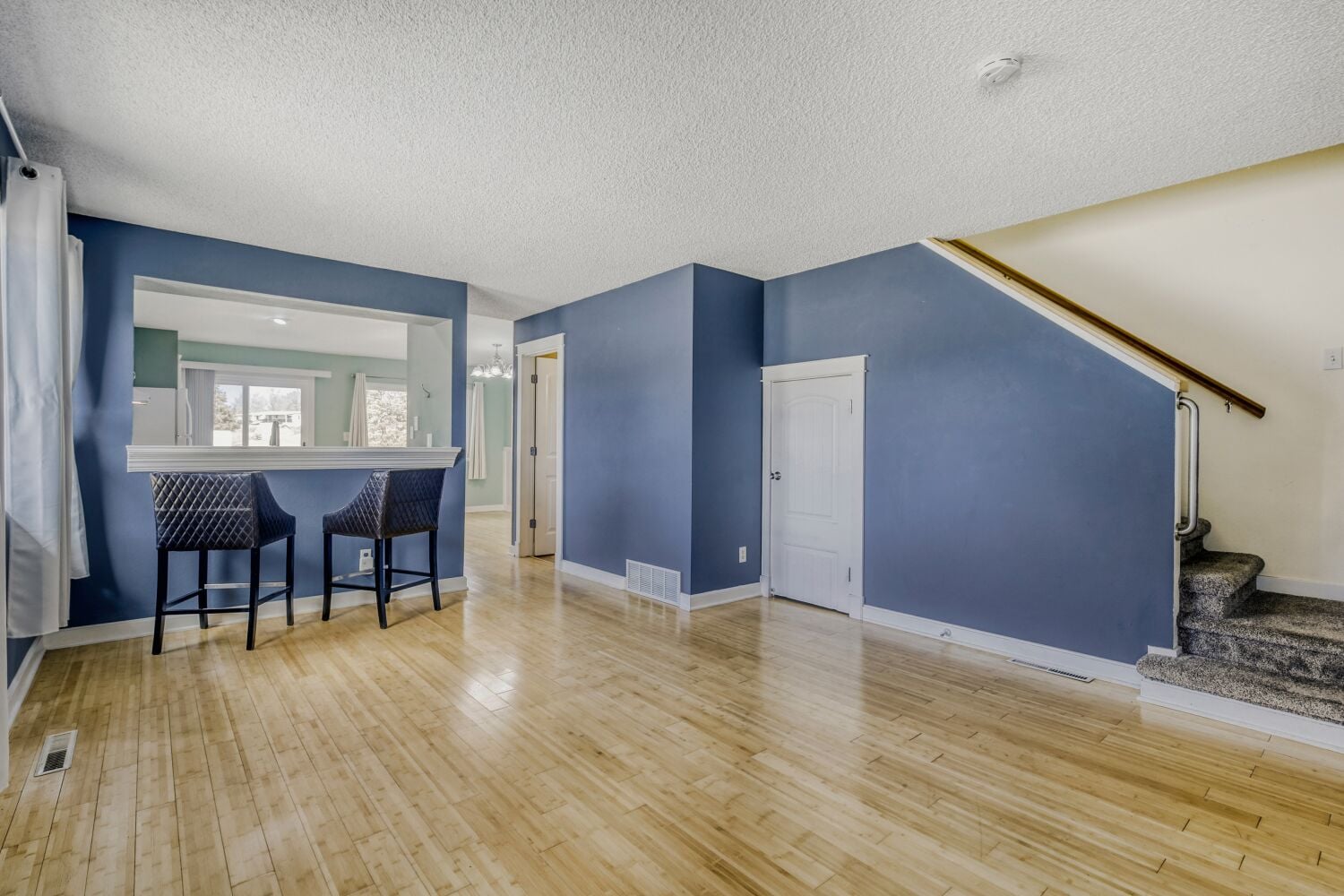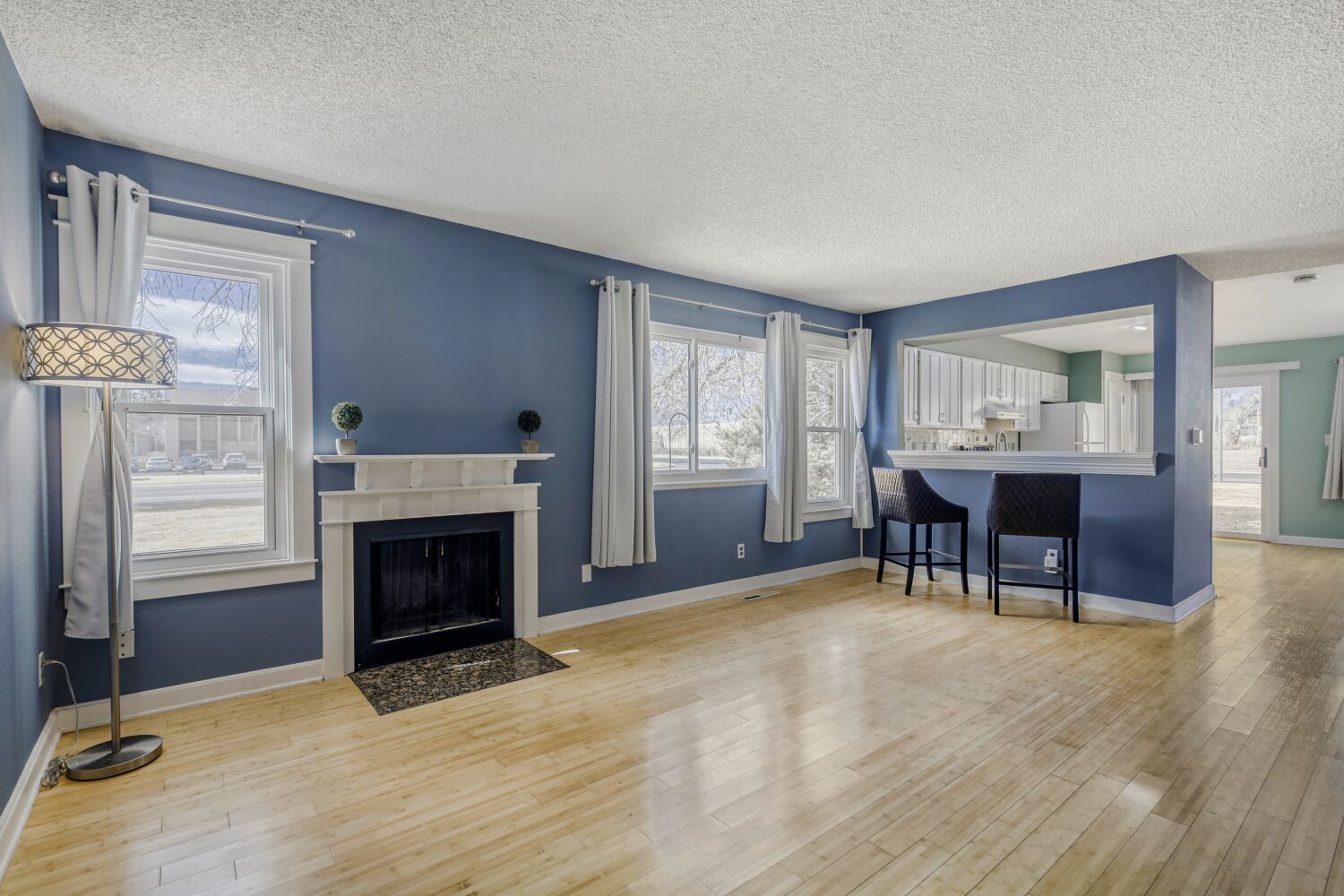 Bamboo flooring on the main level, granite-surround wood-burning fireplace, and an open layout that leads to a private patio. Kitchen features a travertine bar and eat-in nook, plus new oven and dishwasher (Dec 2024).